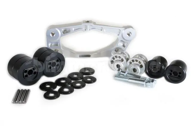 + Take advantage of a 2nd rear diff mount + Raise diff for better axle alignment + Solid bushings have near-zero flex or axle wind-up + More power transferred to the wheels + More direct and positive feedback and road feel + Eliminate the potential failure of stock bushings This bushing set covers the front bracket, rear mounts in subframe, and includes a new rear bracket with two upper mounts instead of the single-mount design used on the original. All mounts are either solid aluminum or a hybrid Delrin/aluminum that provides a more direct response and near-zero deflection compared to the factory rubber or urethane mounts. On race cars we prefer aluminum or Delrin to minimize deflection as much as possible. While urethane might be fine for street use they pale in comparison to solid when used on the track. Solid materials have almost zero wear and tear, eliminating another maintenance item from your prep list. The front mounts in this kit are offset 10mm higher than standard mounts. This raises the diff to better align the rear axle shafts with a lowered suspension. As you lower the ride height the angle of the rear axles becomes more extreme, which could cause premature failure in the CV joints. Raising the diff also helps with clearance between the ground and the diff cooling fins. Because of the solid nature of these bushings we only recommend them for track use. We do offer factory urethane and Powerflex urethane if you want a more street-friendly bushing option (but without the height correction). The new rear bracket includes a 2nd mount for the passenger side bushing. There is a place for the mount in the rear subframe but BMW chose not to utilize it. The KMP bushings do away with the factory vibration absorber on the upper bolt. New upper hex bolts are included. Note: front bushing bracket not included. The supplied bushings will need to be pressed into your existing bracket. A small amount of the casting must be ground off for clearance. You can re-use all of your existing hardware or add new hardware using the links below. BMW Fitments: 2 Series F87 (2016+) > M2 CS Racing F87 (2016+) > M2 Competition S55 (2019+) 3 Series F80 (2015-2018) > M3 (2015-2018) 4 Series F82 / F83 (2015-2020) > M4 (2015-2020) F82 / F83 (2015-2020) > M4 GT4