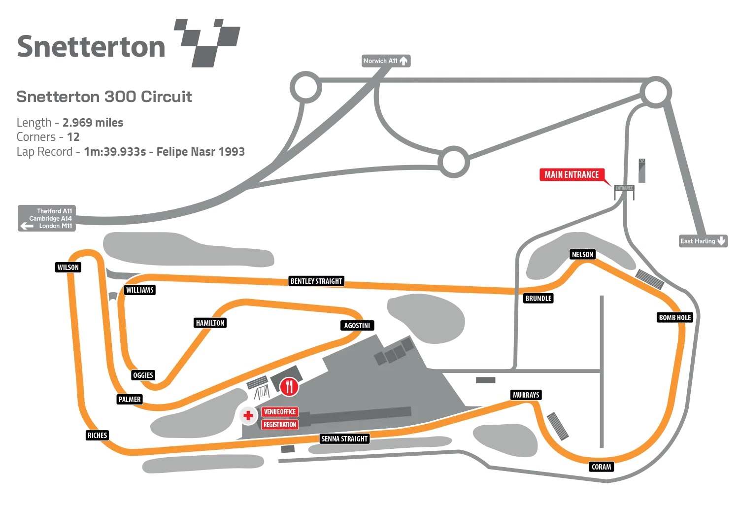 You’ll find the circuit 10 miles north-east of Thetford on the A11 from London to Norwich. Coming from the south, leave the M11 at junction 9 and follow the A11. From the north or west, use the M11/A11 and join the A11 after Newmarket.